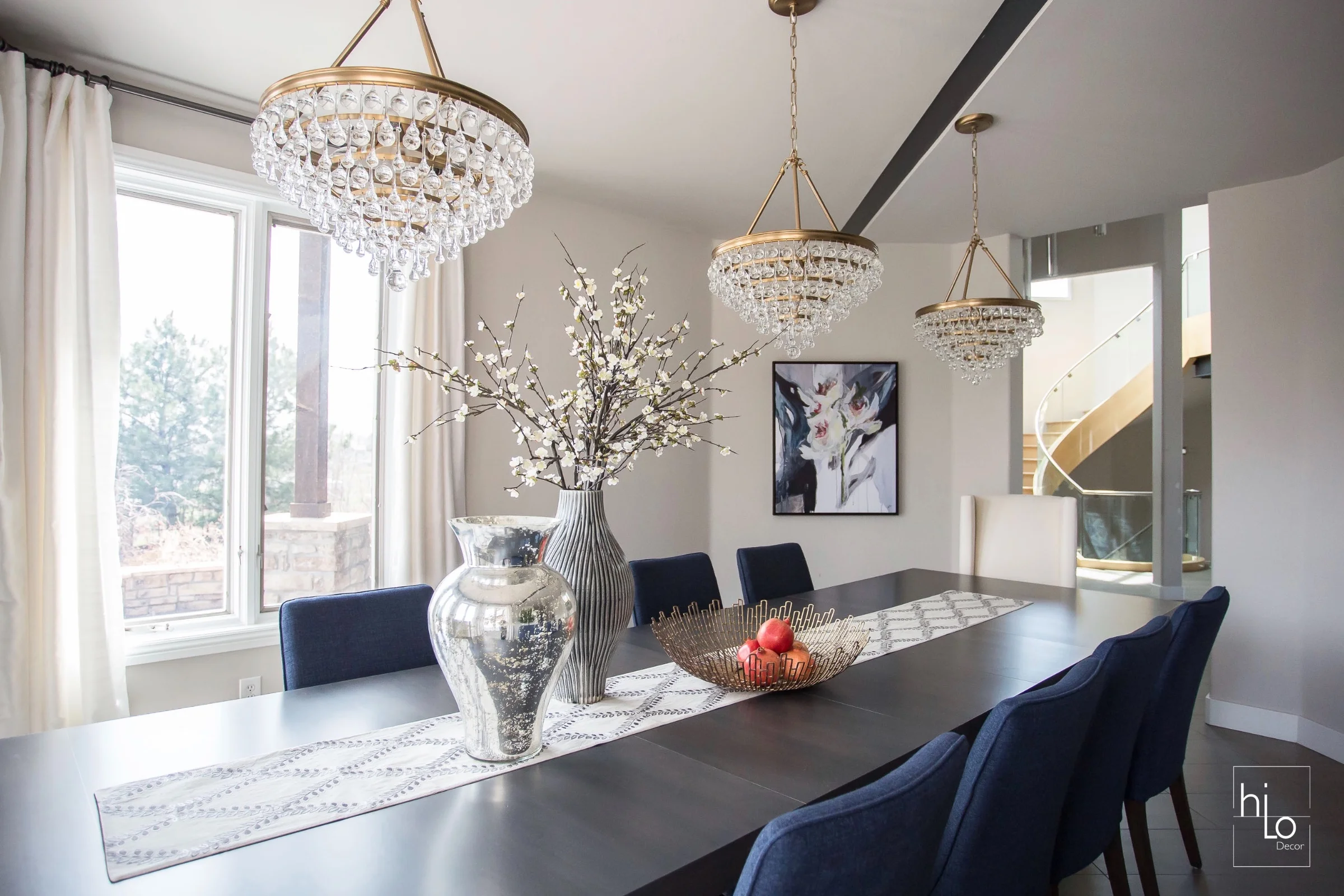 Moving on to the living room: not only does it have a breathtaking view of Colorado’s front range, but it is a showcase for the grid gallery of family photos that occupies an entire wall! We installed nine custom-made 32” square frames with 8x10 openings so that the homeowners can change photos as needed. In addition to a few new accent furniture pieces and lighting, another major feature is new solar shades for the living room windows. However, unlike the grid gallery, which is one of the focal points, we wanted to select a window treatment that drew little attention; instead, it preserves the gorgeous view. Solar shades were the perfect option for a sleek and modern look that doesn’t block the view, yet they still provide shade from the sun’s glare and protect furniture from UV rays.